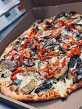 White pizza with a garlic butter sauce, mozzarella, tomato slices, grilled zucchini, grilled eggplant, spinach, roasted red peppers, mushrooms & onions topped with a romano cheese herb mix.